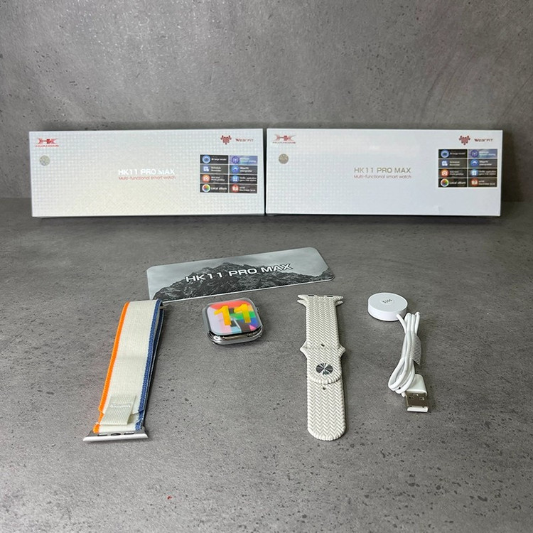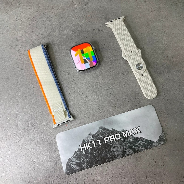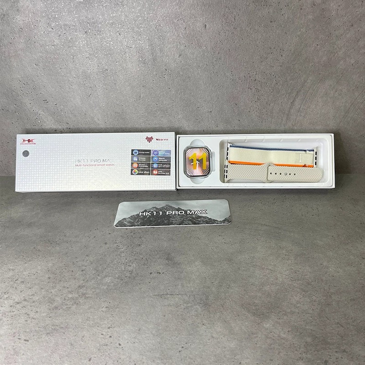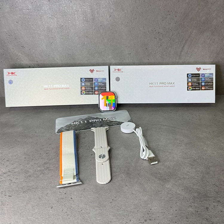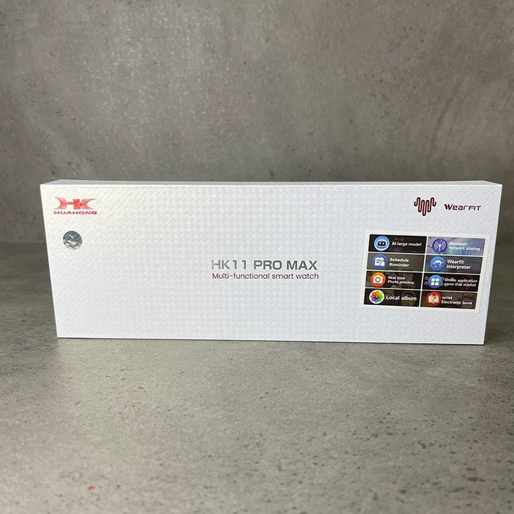 ساعت هوشمند HK11 Pro Max با طراحی مستطیلی و قاب 46 میلیمتری از جنس آلیاژ Kirsite با پوشش IML در رنگهای مشکی و نقرهای عرضه شده و با بند سیلیکونی و اوشن، صفحهنمایش 2.02 اینچی AMOLED با رزولوشن 485×520 پیکسل و قابلیت Always On Display را ارائه میدهد؛ این ساعت با سیستمعاملهای اندروید و iOS از طریق اپلیکیشن WearFit Pro سازگار بوده و با پردازنده دو هستهای SF32LB525، بلوتوث نسخه 5.3، حافظه داخلی برای ذخیره موسیقی و دادهها، میکروفون و اسپیکر داخلی، شارژ بیسیم و باتری 260 میلیآمپر ساعتی با دوام 5 تا 7 روزی، امکاناتی مانند فروشگاه داخلی اپلیکیشن و واچفیس، دستیار صوتی هوشمند، واچفیسهای متحرک، پیشنمایش زنده دوربین، آلبوم عکس محلی، پخش موسیقی داخلی و بلوتوثی، ترجمه صوتی در بیش از 20 زبان، اپهای مسیریابی و سبک زندگی و مجموعه کامل حسگرهای سلامتی شامل ضربان قلب، فشار خون، اکسیژن خون، پایش خواب، گامشمار و یادآور نشستن را در اختیار کاربر قرار میدهد؛ همچنین این ساعت با مقاومت در برابر آب استاندارد IP68 همراه بوده و به همراه بند، کابل شارژ بیسیم و دفترچه راهنما ارائه میشود.