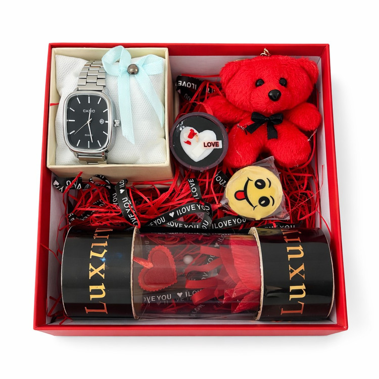 باکس هدیه Luxury یک انتخاب آماده و شیک برای مناسبتهای عاشقانه است. ترکیب ساعت مچی بههمراه عروسک خرسی قرمز و شکلاتهای طرحدار، این ست را به یک هدیه کامل تبدیل میکند؛ بدون نیاز به بستهبندی اضافه. داخل باکس با پوشال و تزئینات مرتب شده تا هنگام باز کردن، جلوهی هدیه کاملاً خاص و لاکچری باشد. مناسب هدیه دادن برای ولنتاین، سالگرد آشنایی، تولد و سورپرایزهای عاشقانه.